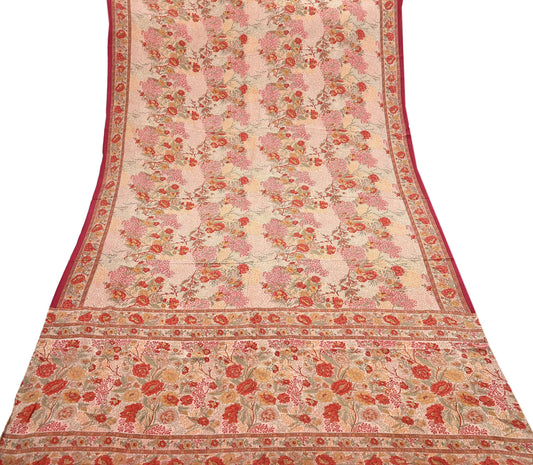 Indian Vintage Sari Maroon & beige Pure Crepe Silk Printed Saree 6yard Sewing Quilting Floral Soft Craft Fabric Wrap
