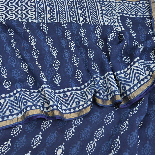 Indian Vintage Sari Blue Pure chanderi Silk Bagru Printed Sarees Fabric 5Yd Floral Soft Golden Zari Border Ethnic Dress making Upcycle