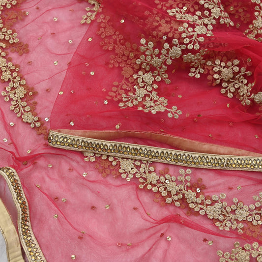Indian Pre-owned Heavy Dupatta Red Net Long Stole Hand Embroidered By Designer Abu Jani Scarves Bridal Veil