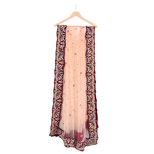 Indian Pre-owned Heavy Wedding Peach Net/Mesh/ Velvet Hand Embroidered Dupatta Designer By Anamika Khanna Bridal Wear