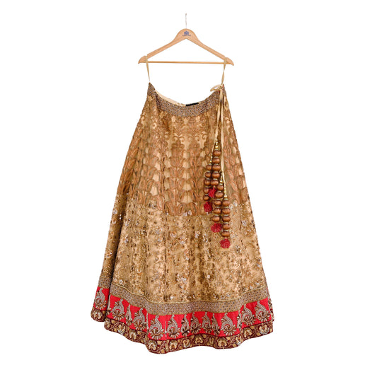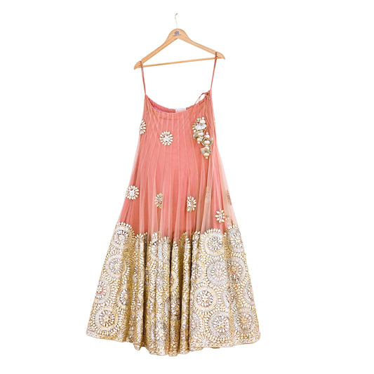 Pre-Owned Designer Abu Jani Hand Embroidered Peach Net Lehenga Skirt with Gota Patti Work Bridal Couture Heavy Indian Wear