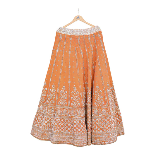 Indian Pre-owned Heavy Wedding Hand Embroidered Designer By Anamika Khanna Lehenga/Skirt Bridal Wear Saffron Pure Satin Silk