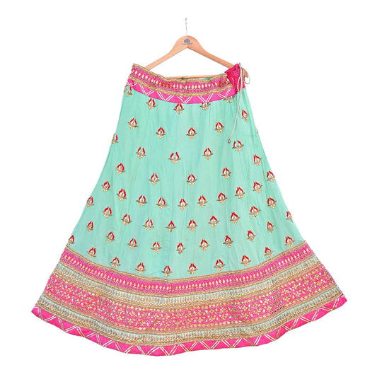Designer Abu Jani Green & Pink Raw Silk Bridal Skirt, Gota patti Work Lehenga, Hand Embroidered Couture Indian Wedding Wear, Festive Outfit