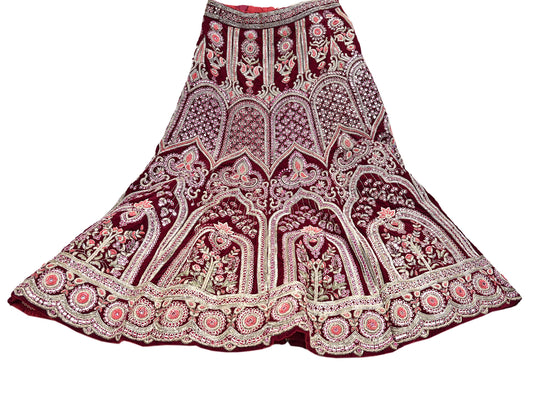 Manish Malhotra Maroon Velvet Lehenga Skirt Heavy Zardozi Dabka Embroidery Indian Bridal Wear, Designer Couture Wedding Outfit