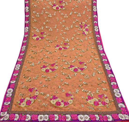 Indian Vintage Peach Saree Pure Chiffon Silk Pre-owned Hand Beaded Abu jani Designer Sari Fabric 5-Yards Soft Ethnic Bollywood Party sarees