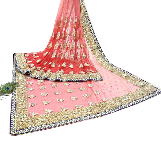 Indian Pre-Owned Sari Red & Peach Net/Mesh Hand Embroidered Designer Manish Malhotra Sarees 5Yd Ethnic Zardozi/Dabka Zari Wedding Saree