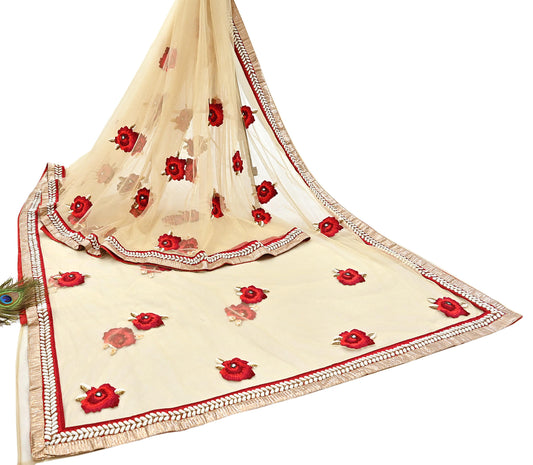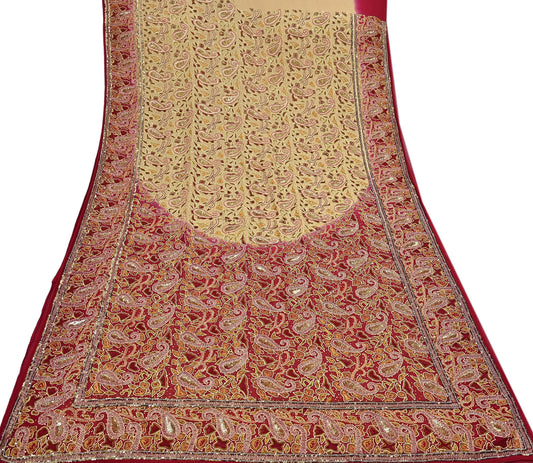 Indian Pre-owned Heavy Sari Beige & Red Pure Georgette Silk Hand Embroidered Sarees Designer Abu Jani 5Yd Sewing Ethnic Sarees