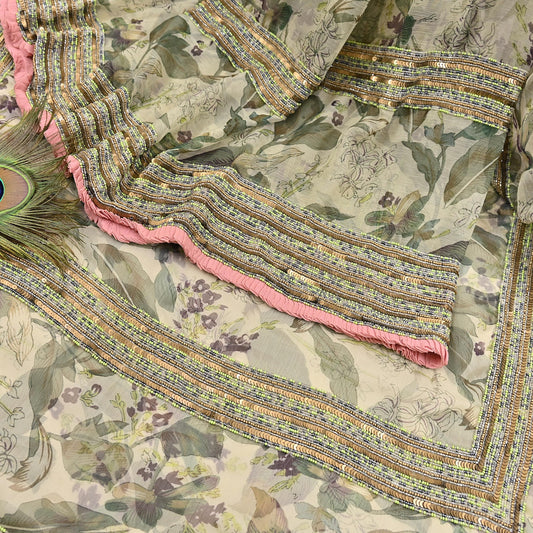 Indian Pre-owned Sari Green & Ivory Pure Georgette Silk Hand Embroidered Anamika Khanna Designer Sarees Ethnic 6Yd Sewing Wedding Sarees