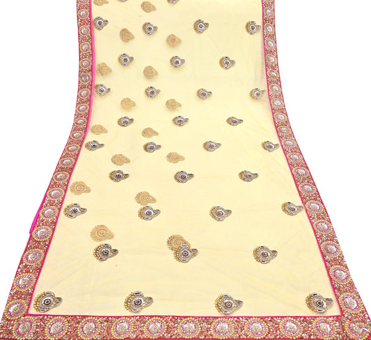 Indian Pre-owned Saree Beige & Red Pure Silk, Net Hand Embroidered Sabyasachi Designer Sari 6Yd Soft Ethnic Bollywood Party saree