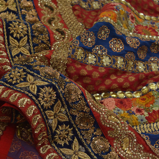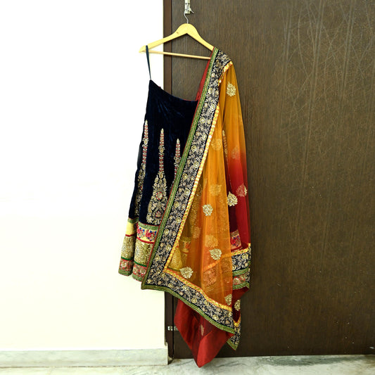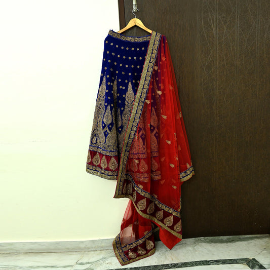 Indian Pre-owned Heavy Wedding Red & Blue Net/Mesh/ Velvet Hand Embroidered Lehenga/Dupatta Designer By Sabyasachi Zardozi Bridal Wear