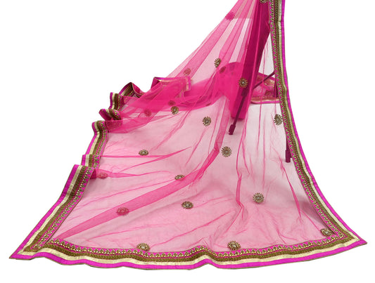 Indian Pre-owned Heavy Wedding Dupatta Pink Net Mesh Long Stole Hand Embroidered Abu Jani Designer Scarves Zardozi Dabka Bridal Veil