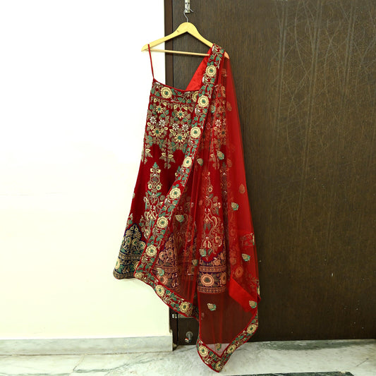 Indian Pre-owned Heavy Wedding Red Net/Mesh/ Pure satin Silk Hand Embroidered Lehenga/Dupatta Designer By Sabyasachi Zardozi Bridal Wear