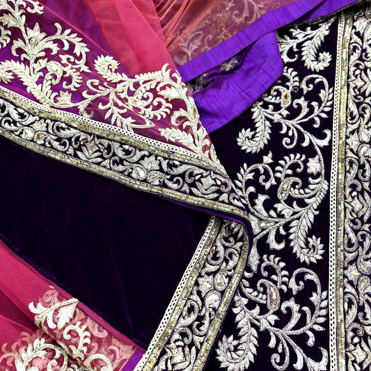 Indian Pre-Owned Sari Purple & Pink Net/Mesh/Velvet Hand Embroidered Designer Manish Malhotra Sarees Ethnic Zardozi/Dabka Zari Wedding Saree