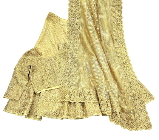 Indian Pre-owned Heavy Wedding Golden Pure Tissue Silk Hand Embroidered Lehenga 3pcs Set By Designer Abu Jani Bridal Wear With Blouse