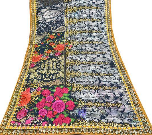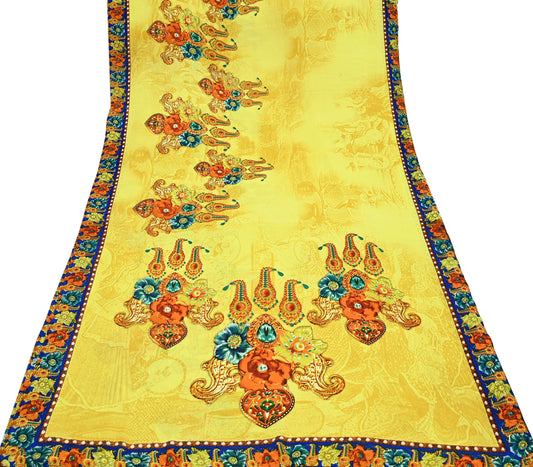 Indian Vintage Yellow Moss Crepe Digital Printed Saree | Floral Design | 6 Yards | Soft Craft Fabric for Dressmaking, Décor, Quilting