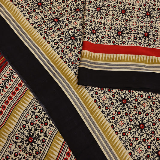 Women Vintage Sari Beige & Black Pure Georgette Silk Digital Printed Saree Craft Fabric Sewing 5Yd Light Dress Making Geometric Crafting