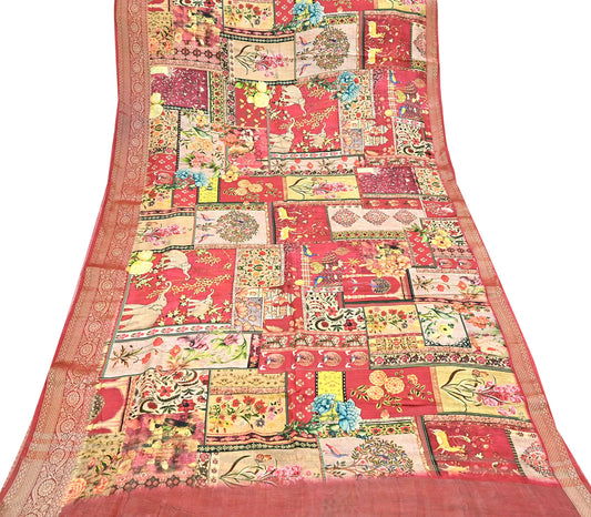 Indian Vintage Red Chanderi Silk Saree Digital Printed Floral Zari Border 5 Yards Fabric for Sewing Christmas Crafts
