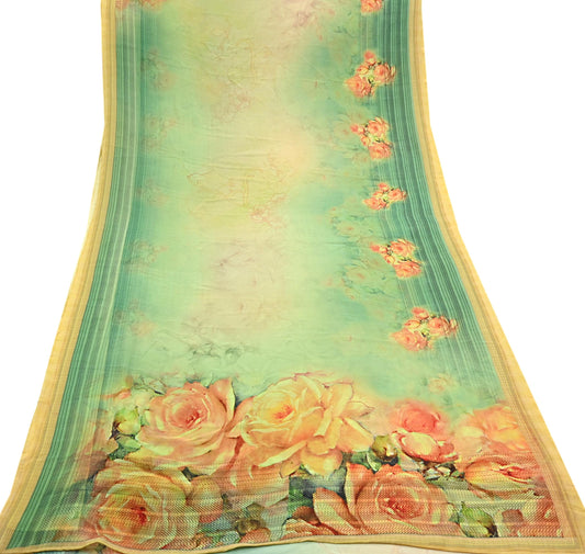 Indian Vintage Sari Green Blend Silk Woven Digital Printed Saree Craft Fabric 5yd Soft Dress Designing Crafting Quilting