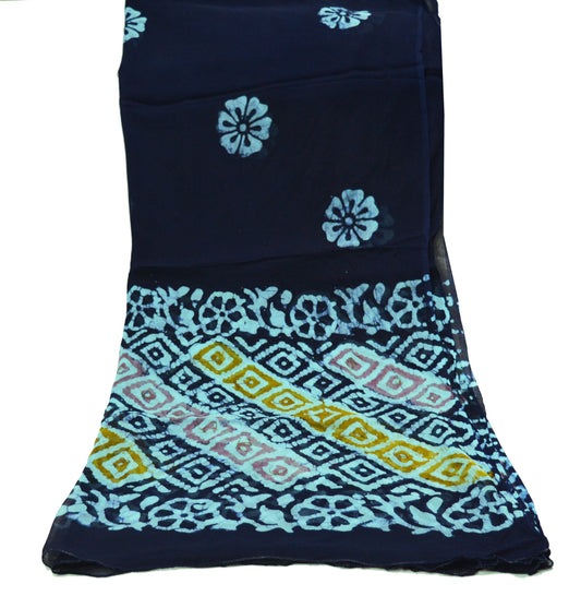 Indian Vintage Blue Dupatta Blend Chiffon Long Stole Block Printed Scarves Floral Design Stole Veil Wrap
