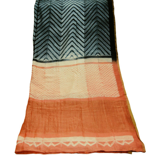 Indian Vintage Peach & Black Dupatta Long Stole Hand Block Print Pure Chanderi Silk Indian Scarves Veil Golden Zari