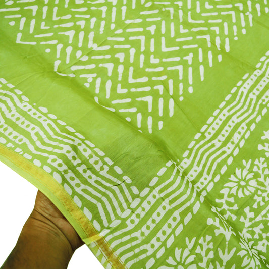 Indian White & Green Vintage Dupatta Long Stole Block Print Pure Chanderi Silk Indian Scarves Veil Golden Zari Soft