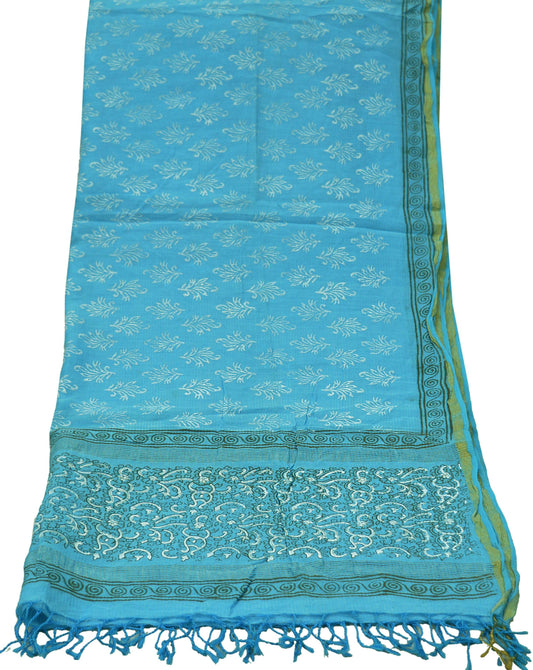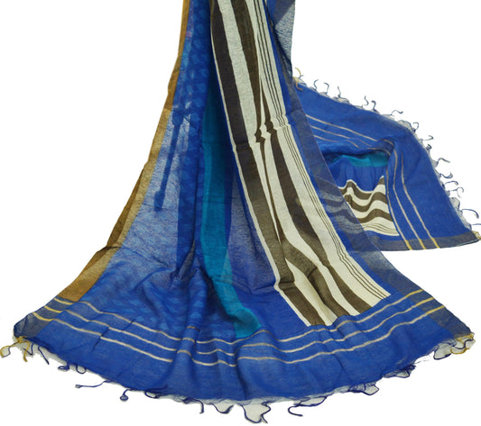 Indian Blue Vintage Dupatta Long Stole Printed Woven Pure Chanderi Silk Indian Scarves Veil Golden Zari Soft Fringes