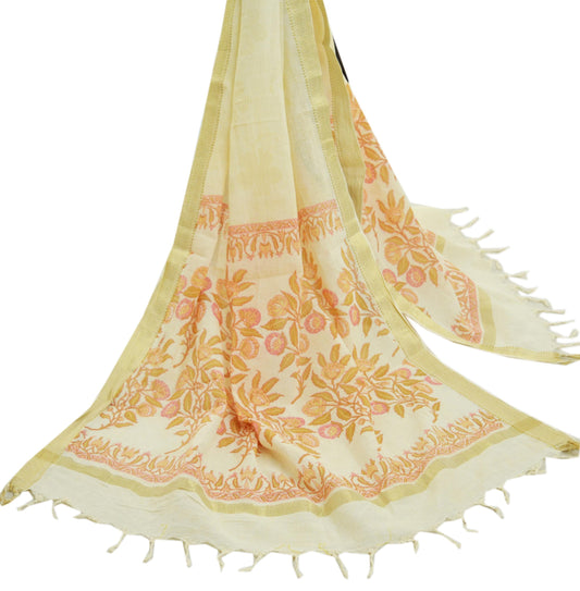 Indian Vintage Ivory Dupatta Long Stole Block Print Pure Cotton Indian Scarves Scarf Veil Wrap Boho Soft Floral Zari fringes