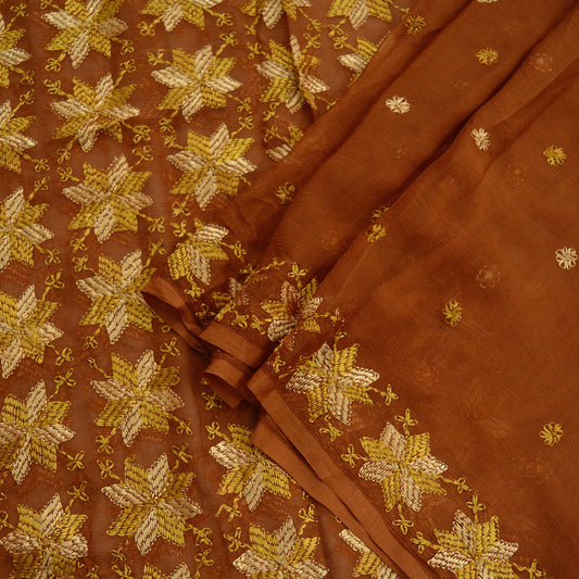 Indian Vintage Brown Dupatta Long Stole Pure Chiffon Silk Hand Embroidered Bagh Phulkari Stole Scarves Golden lace