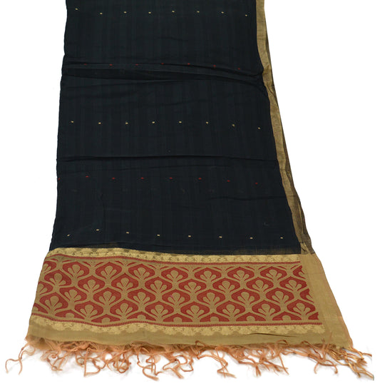 Indian Vintage Dupatta Black Long Stole Printed Woven Pure Chanderi Silk Indian Scarves Veil Golden Zari Soft Fringes