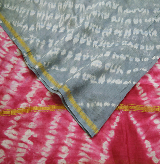 Indian Vintage Gray & Pink Dupatta Long Stole Hand Tie-Dye Print Pure Chanderi Silk Indian Scarves Veil Golden Zari