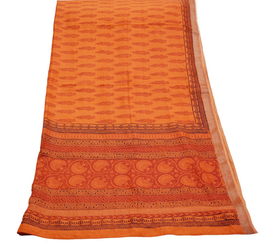 Indian Vintage Orange Dupatta Long Stole Block Print Pure Chanderi Silk Indian Scarves Veil Golden Zari Soft Floral Design