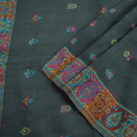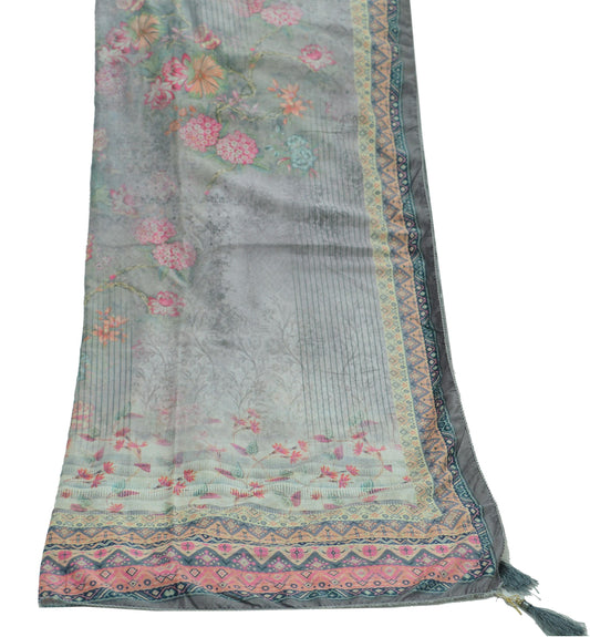 Indian Vintage Gray Dupatta Long Stole Pure Silk Hand Woven Scarves Veil Scarf Wrap Floral Fringes
