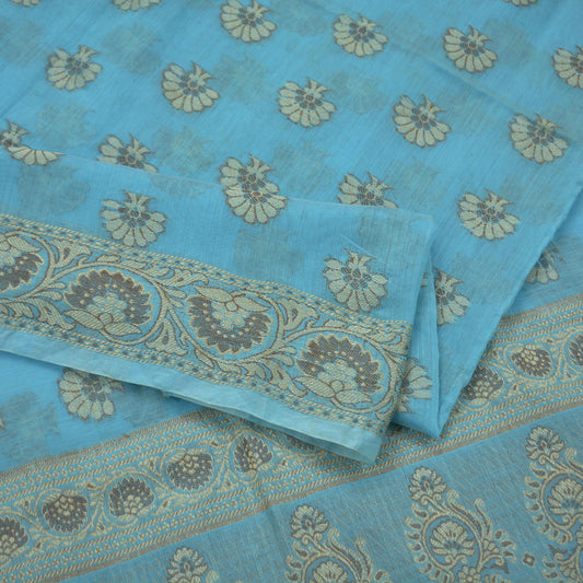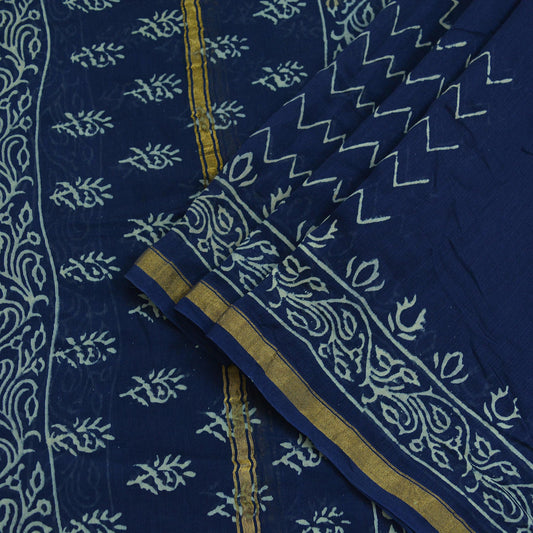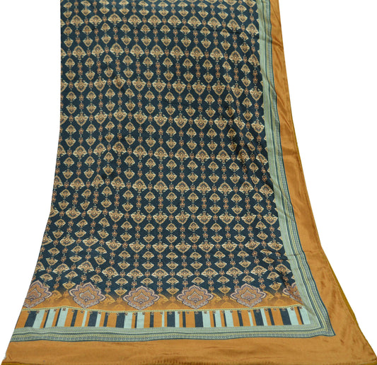 Indian Vintage Blue Dupatta Long Stole Block Print Pure Chanderi Silk Indian Scarves Veil Golden Zari Paisley Design