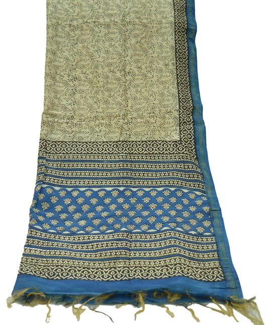 Indian Vintage Ivory & Blue Dupatta Long Stole Block Print Pure Chanderi Silk Scarves Veil Paisley Upcycle Party wear hijab Zari Border