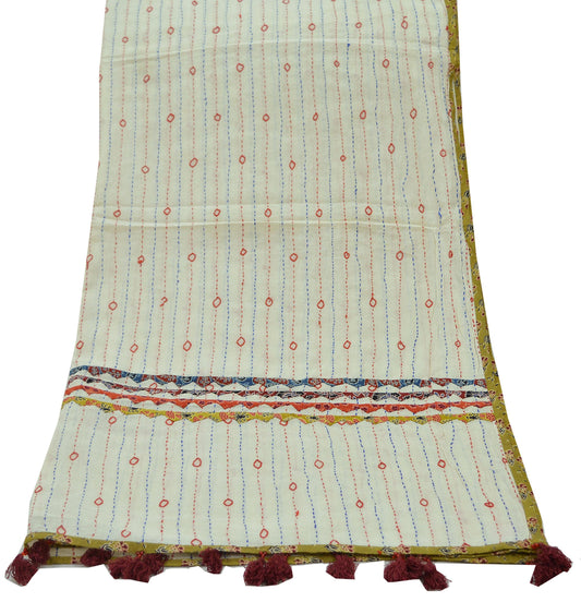 Indian Vintage Dupatta Ivory Long Stole Hand Embroidered Kantha Pure Cotton Scarves Scarf Veil Wrap Boho Soft Floral Design Fringes Patches