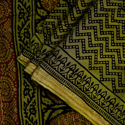 Indian Vintage Green Dupatta Long Stole Hand Block Print Pure Chanderi Silk Scarves Veil Golden Zari