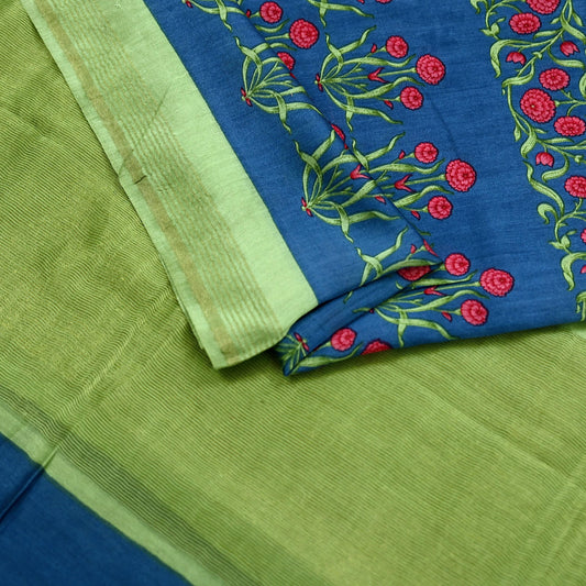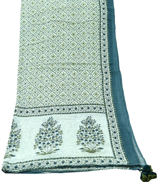 Indian Vintage Green & Blue Dupatta Long Stole Block Print Pure Chanderi Silk Indian Scarves Veil Golden Zari Floral Design For her