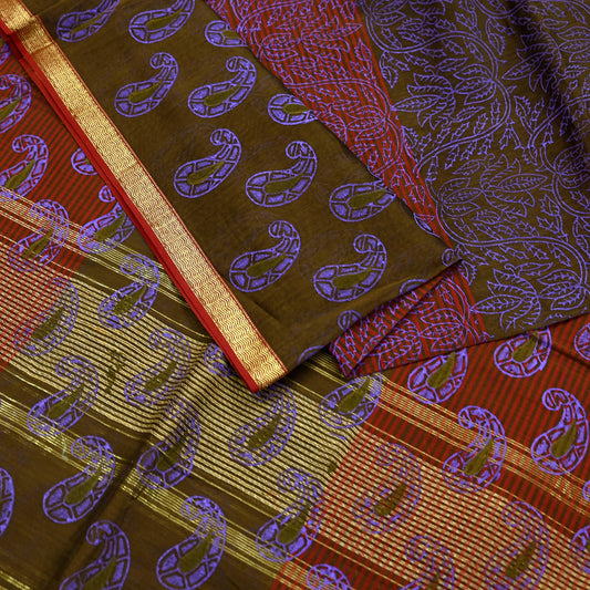 Indian Vintage Brown Dupatta Long Stole Block Print Pure Chanderi Silk Scarves Veil Floral Design Upcycle Party wear hijab Zari Border