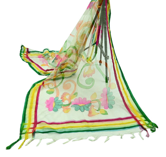 Indian Vintage Dupatta Ivory Long Stole Organza Printed Scarves Veil Soft Floral Design Fringes Scarves Scarf