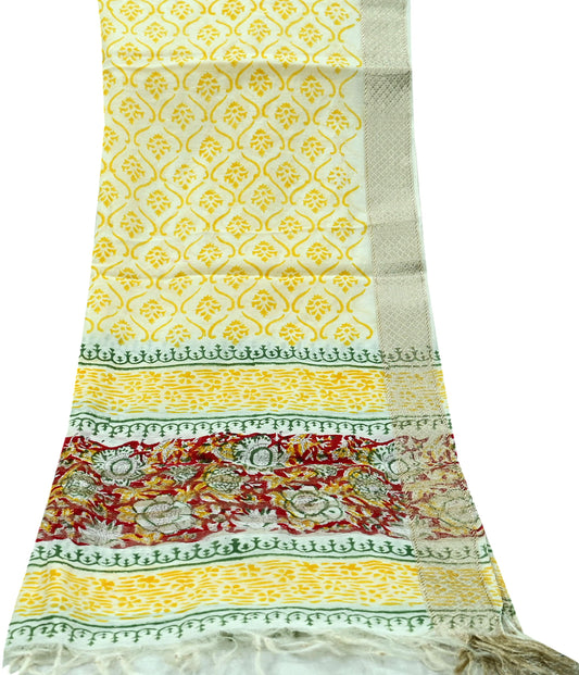 Indian Vintage Dupatta Long Stole Woven Block Painted Pure Chanderi Silk Indian Scarves Veil Golden Zari Floral Design For her