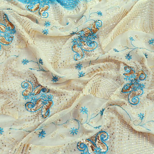 Indian Vintage Dupatta Blue & Ivory Pure Georgette silk Long Stole Embroidered Scarves Stole Veil Wrap Sequins Zari