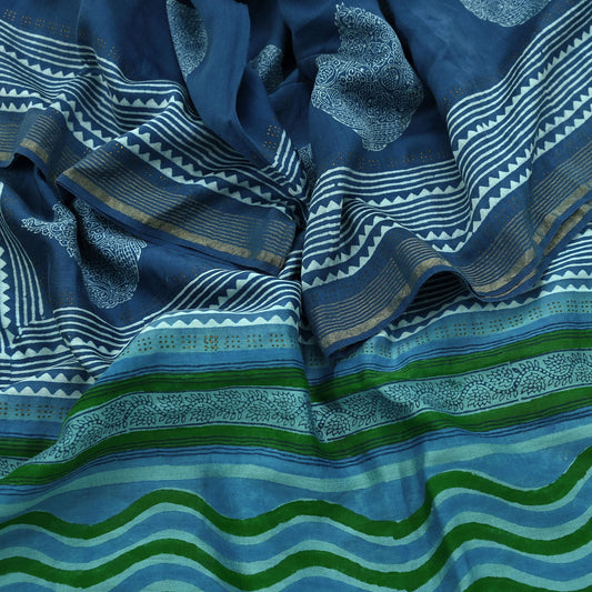 Indian Vintage Blue & Green Dupatta Long Stole Hand Block Print Pure Chanderi Silk Scarves Veil Golden Zari