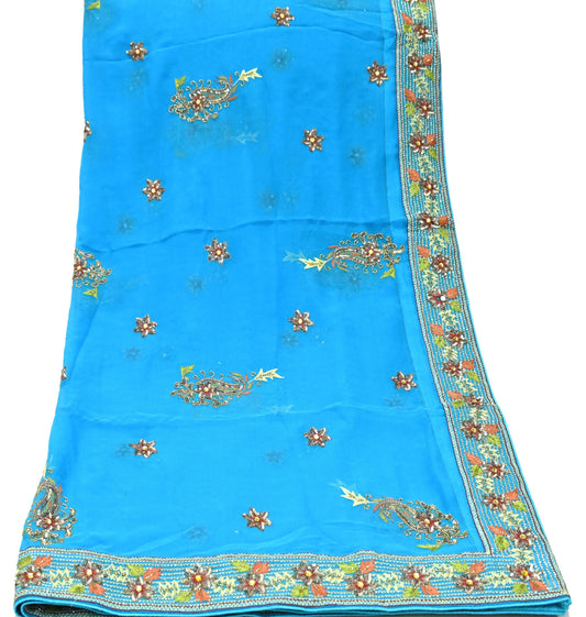 Indian Vintage Blue Dupatta Long Stole Pure Georgette Silk Hand Embroidered Scarves Veil Hijab Floral Zari