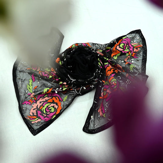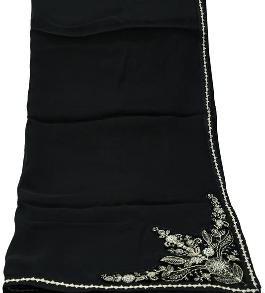 Indian Vintage Dupatta Black Long Stole Pure Organza Silk Hand Embroidered Scarves Veil Zari Sequins