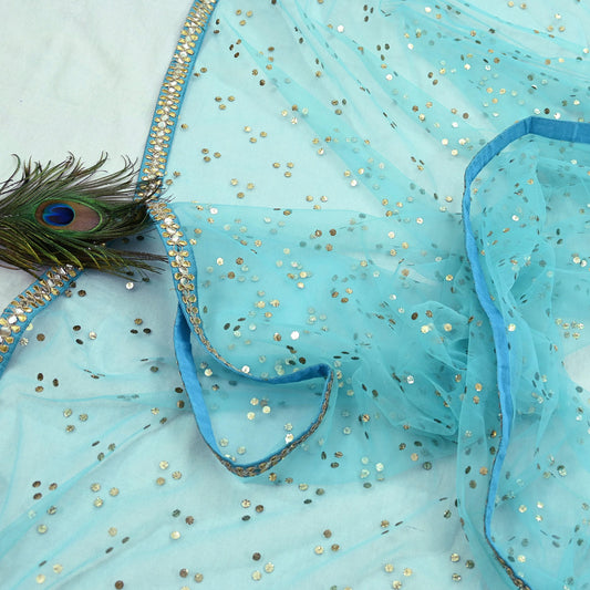 Indian Vintage Blue Dupatta Long Stole Net Mess Hand Embroidered Scarves Veil Hijab Golden Sequins gota patti mukesh work