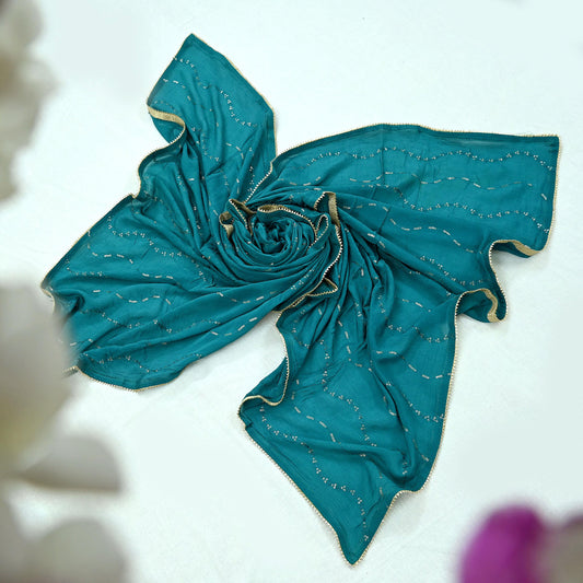 Indian Teal Green Vintage Dupatta Long Stole Hand Embroidered Blend Cotton Scarf Veil Soft Floral