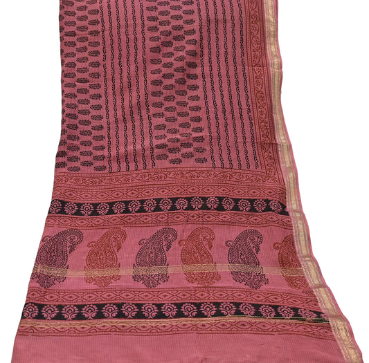 Indian Pink Vintage Dupatta Long Stole Block Print Pure Chanderi Silk Scarves Veil Golden Zari Soft Paisley Design