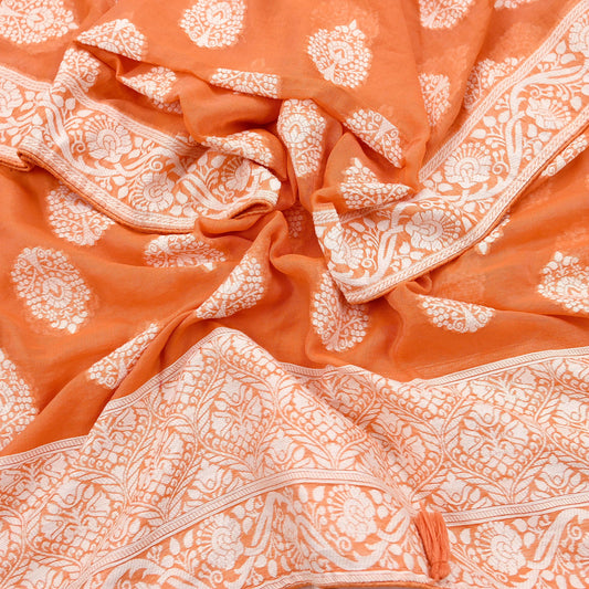 Indian Vintage Orange Dupatta Long Stole Woven Cotton Scarves Veil Fringes Soft Floral Design