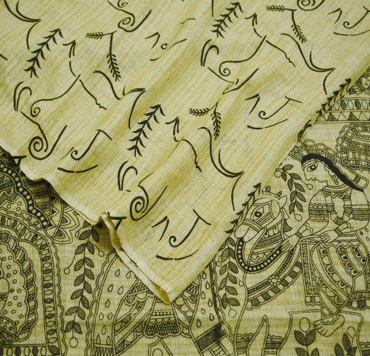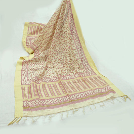 Indian Vintage Dupatta Ivory Long Stole Block Printed Woven Pure Silk Scarves Veil Soft Fringes