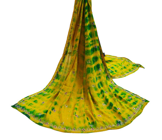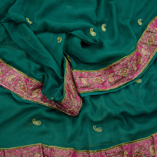 Indian Vintage Green Dupatta Pure Chiffon silk Long Stole Hand Embroidered Scarves Floral Design Veil Wrap Zari Zardozi Banarasi Border